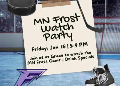 Stop by Graze Food Hall by Travail to enjoy drink specials and watch the MN Frost take on the NY Sirens. |