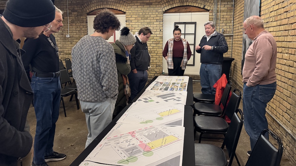 Minneapolis Parks Assistant Superintendent for Planning Michael Schroeder, (2nd from right) explains the new dog park location to North Loop dog parents. Your dog park correspondent Ali Odenthal is 3rd from right.