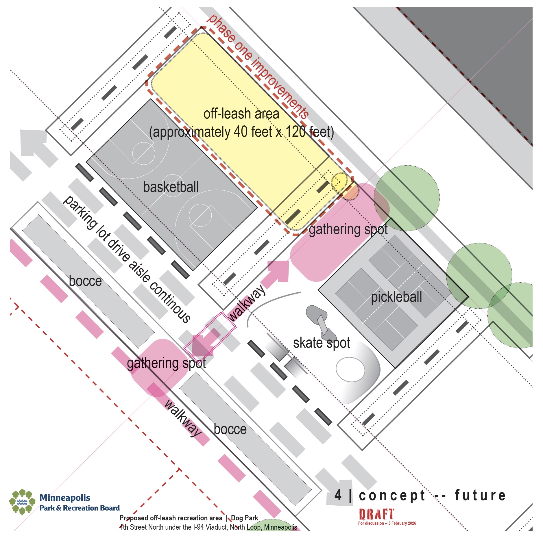 Taking all these factors into consideration, the land under the highway off N 4th Street was identified, as it has already been part of a long-term plan by the MPRB (see page 95 of this plan if you’re really interested!). By working with the Minneapolis Parking Authority and MNDOT, this land could be leased by MPRB for that 20-year requirement. Traffic noise from the freeway above would help moderate the sounds of pups enjoying themselves at the park, and the freeway itself would provide coverage from rain and snow. There would also be additional space available to include public art, like at North Loop Green, or eventually construct pickleball or basketball courts.