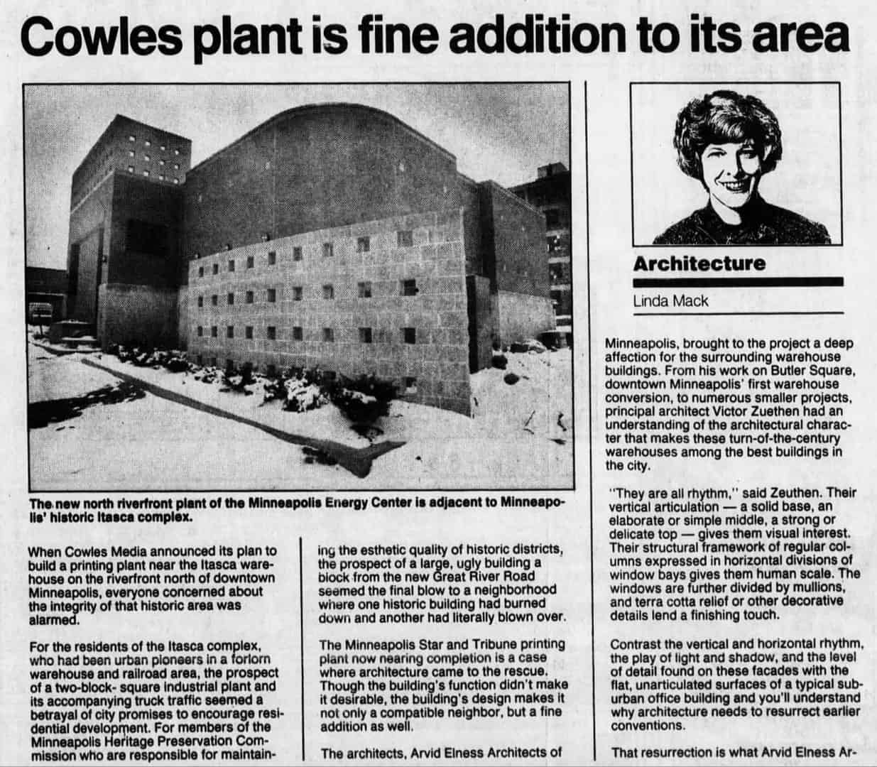 When the plant was built in 1987, there was a bit of concern about how it would affect the emerging North Loop neighborhood, as you can see in the article below. But the architects added decorative touches to the design, including the tower, to help it blend into the surrounding historic warehouses.